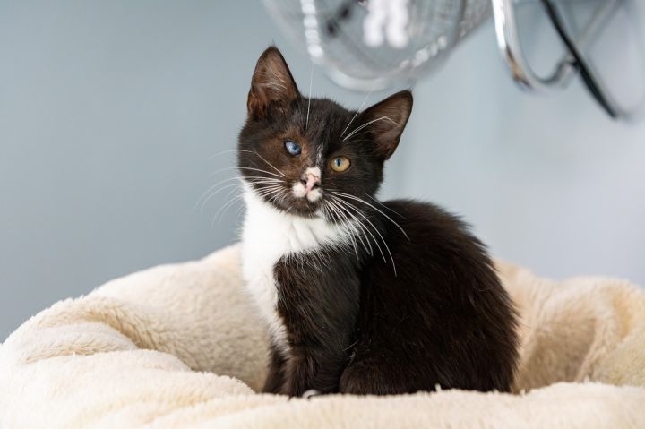 Krokiet - czarny z białym krawatem chłopczyk urodzony w lipcu 2025. Jest przepięknej urody dostojnym kocurkiem. Przeszedł koci katar, który pozbawił go widzenia w jednym oku, drugie jest zdrowe.