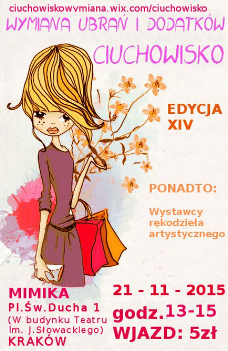 Kolejna edycja szalonej wymiany ubrań i dodatków czyli Krakowskiego Ciuchowiska. Widzimy się w Mimice (dawne Cafe Foyer) pl.św. Ducha 1. Wymiana odbywać się będzie na stołach. Na miejscu bar z piciem i jedzonkiem:)