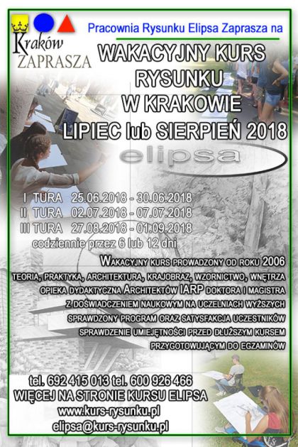 Zajęcia prowadzone są w profesjonalnej pracowni kursu rysunku przez architektów, członków SARP i IARP, doktora inż. arch. oraz magistra inż. arch. WAPK, KAAFM z doświadczeniem branżowym i dydaktycznym. W programie przedstawiamy system pracy projektanta, prezentujemy oryginalne oprogramowanie CAD, którym dysponuje nasza pracownia, a przede wszystkim prezentujemy sztukę rysowania w technice ołówkowej i nie tyko. Zajęcia odbywają się w Pracowni Elipsa przy ul. Krowoderskiej 6/14 oraz w plenerach Krakowie. Naszym atutem jest praktyczna wiedza w zakresie projektowania oraz doświadczenie w nauce rysunku od 1998 roku. Elipsa jest jednym z najdłużej działających kursów rysunku w Krakowie.