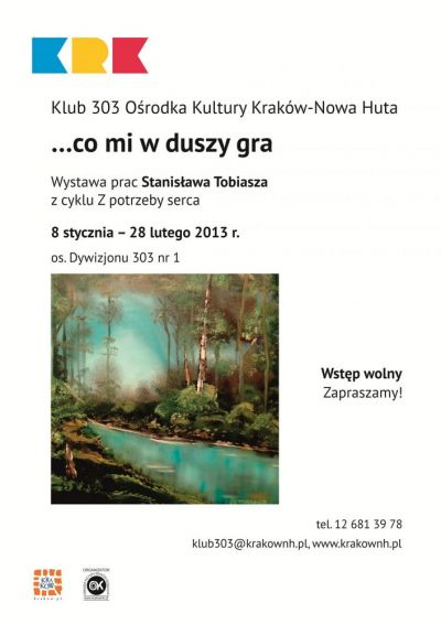 Klub 303 Ośrodka Kultury Kraków-Nowa Huta (os. Dywizjonu 303 nr 1) zaprasza od 8 stycznia do obejrzenia kolejnej wystawy z cyklu Z potrzeby serca. Wystawa, która jest podsumowaniem dorobku artystycznego Stanisława Tobiasza, potrwa do 28 lutego 2013 r.