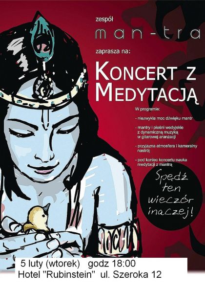 Zespół muzyczny "Man-tra" zaprasza na relaksujący wieczór ze starożytnymi mantrami i pieśniami wedyjskimi w nowoczesnej i dynamicznej aranżacji muzycznej. Pod koniec koncertu nauka medytacji, dzięki której każdy, kto chce, może zabrać medytację do swojego życia. A wraz z nią wszystkie korzyści z niej płynące.