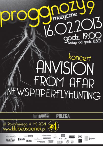 AnVision na scenie towarzyszyć będzie From Afar - grupa powstała w 2005 roku. Następne lata działalności to poszukiwania optymalnego składu i rozwój artystyczny, który zaowocował w 2012 roku debiutancką EPką The Abyss Gazes Into You. From Afar w swej twórczości oscyluje między rockiem i metalem nie unikając jednak momentów delikatniejszych i silniej lirycznych. 16 lutego na scenie Zaścianka zaprezentuje się również Newspaperflyhunting - białostocka formacja grająca melodyjną muzykę z pogranicza postrocka i rocka progresywnego. Historia zespołu sięga 2006 roku, debiutancki album długogrający, no12listen, wydany został natomiast w roku 2011.
