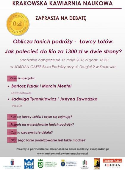 | Krakowska Kawiarnia Naukowa zaprasza na debatę: Oblicza tanich podróży - Łowcy Lotów. Jak polecieć do Rio za 1300 zł w dwie strony? |