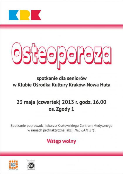 Tematem spotkania w Klubie Ośrodka Kultury Kraków-Nowa Huta (os. Zgody 1) będzie profilaktyka oraz leczenie osteoporozy, która jest poważną chorobą, a zaniedbana prowadzi do ciężkich złamań, nawet przy niegroźnych upadkach. Spotkanie pozwoli zainteresowanym uzyskać odpowiedzi na wszelkie pytania dotyczące osteoporozy. Spotkanie poprowadzi lekarz z Krakowskiego Centrum Medycznego w ramach profilaktycznej akcji Nie łam się.