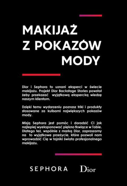 „DNA Sephora to makijaż, dlatego firma regularnie dzieli się z Polkami swoją wiedzą na tematy związane z makijażem, począwszy od najgorętszych światowych trendów oraz technik i trików stosowanych przez wiodących wizażystów, po szczegółowe instrukcje jak wykonać makijaż, dostępne na naszym blogu blogmakijaz.pl. Chętnie też korzystamy z naszej mocnej pozycji w świecie mody i bliskiej współpracy z wiodącymi światowymi markami kosmetycznymi, które zapraszamy do perfumerii Sephora, aby dzieliły się swoją wiedzą z naszymi klientkami. Z tej filozofii zrodził się pomysł spotkań Dior Backstage Stories, dzięki którym dowiesz się jak dzięki prostym trikom i produktom stosowanym podczas przygotowań do pokazów mody stworzyć profesjonalny makijaż. Będzie to kolejny krok wtajemniczenia w świat profesjonalnego makijażu” – powiedział Sergiusz Osmański, dyrektor artystyczny i PR, Sephora Polska. „Makijaże z pokazów mody marki Dior są niesamowicie inspirujące, a przy ich tworzeniu pracują światowej sławy makijażyści, dlatego gorąco zachęcam do wzięcia udziału w Dior Backstage Stories” – dodał Sergiusz Osmański.
