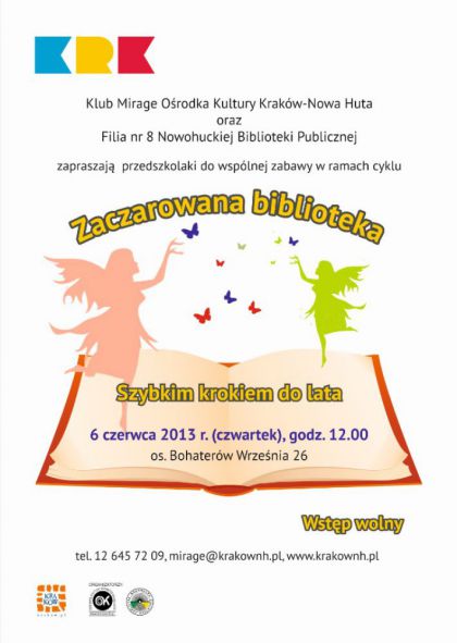 Klub Mirage Ośrodka Kultury Kraków-Nowa Huta (os. Bohaterów Września 26) zaprasza 6 czerwca br. o godz. 12.00 na kolejne zajęcia edukacyjno-relaksacyjne dla przedszkolaków z cyklu Zaczarowana biblioteka.