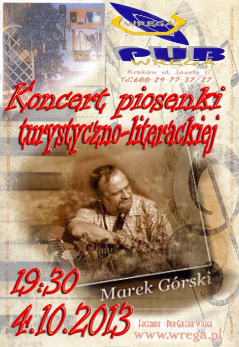 Pub Galeria WRĘGA zaprasza serdecznie na piątkowy koncert piosenki turystyczno-literackiej.Wieczór uświetni nam legenda wielu przeglądów i festiwali sam Marek Górski.