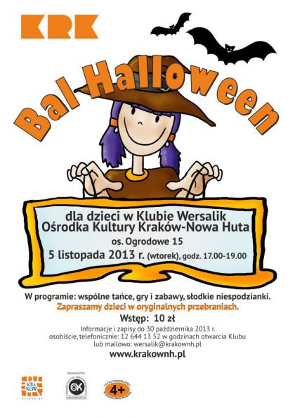 Klub Wersalik Ośrodka Kultury Kraków-Nowa Huta (os. Ogrodowe 15) zaprasza dzieci 5 listopada w godz. 17.00-19.00 na halloweenowy bal.