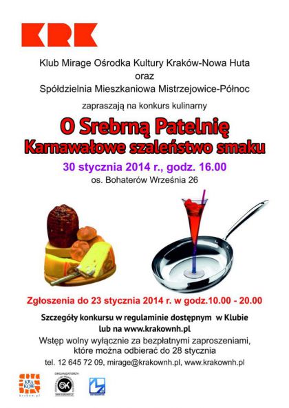 Karnawał to czas hucznego świętowania Nowego Roku podczas całonocnych zabaw. Niezależnie od tego czy organizujemy bal maskowy, imprezę tematyczną, czy kameralne spotkanie w gronie znajomych warto pomyśleć o przygotowaniu niecodziennych dań, które umilą wspólnie spędzony czas i dostarczą energii do tanecznego szaleństwa. Przepis na udane karnawałowe przyjęcie to nie tylko dobra muzyka i doborowe towarzystwo, ale również ciekawe menu. Klub Mirage zaprasza do udziału w kolejnej edycji konkursu O Srebrną Patelnię.