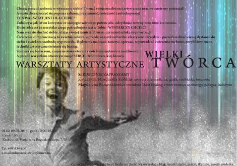 Chcesz poczuć wolność w wyrażaniu siebie? Poznać swoje możliwości artystyczne oraz wewnętrzny potencjał? A może chcesz uczyć się poprzez zabawę, przyjemność, twórczość i autoekspresję? TEN WARSZTAT JEST DLA CIEBIE! Zobaczysz jak łatwo korzystać ze swojego twórczego potencjału, odzyskując wewnętrzną moc kreowania. Odkryjesz że wszytko czego potrzebujesz jest w Tobie. WYSTARCZY CHCIEĆ! Nauczysz się słuchać siebie, ufając swojej intuicji.Poznasz czym jest sztuka improwizacji. Ćwiczenia z improwizacją to świetna zabawa, a przede wszystkim bardzo efektywne narzędzie – pozwala nabrać więcej dystansu do siebie i zwiększa swobodę wypowiedzi. Będziemy malować, tańczyć, śpiewać, wprowadzać ćwiczenia ruchowe, przybliżmy różne techniki artystyczne świetnie się bawiąc. Staniesz się badaczem, czujnym obserwatorem swoich umiejętności i możliwości. A przede wszystkim otworzysz swoje SERCE – źródło wszelkiej kreacji.