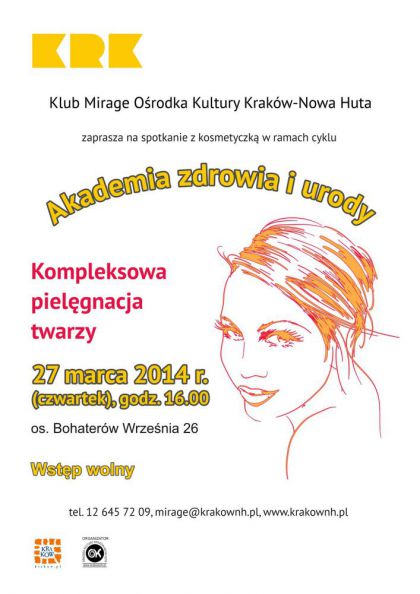 Klub Mirage Ośrodka Kultury Kraków-Nowa Huta (os. Bohaterów Września 26) zaprasza 27 marca o godz. 16.00 na spotkanie z konsultantkami kosmetycznymi w ramach cyklu Akademia zdrowia i Urody.