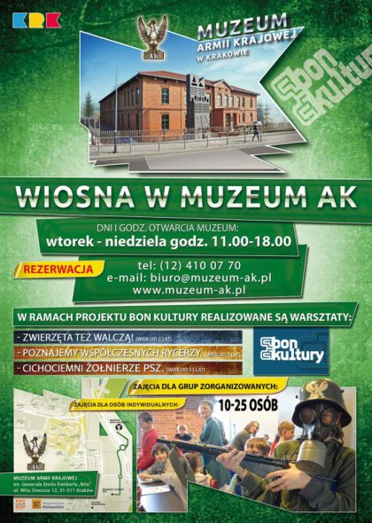 Rezerwacja: kontakt mailowy: rezerwacja@muzeum-ak.pl (wiadomość z dopiskiem "Bon Kultury") lub telefoniczny pod nr (12) 4100765 lub (12) 4100770.