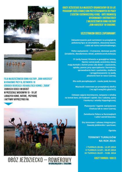 Ośrodek Rekreacji i Rehabilitacji Konnej „Tabun” działający w Młodzieżowym Domu Kultury „Dom Harcerza” już od 28 czerwca zaprasza dzieci i młodzież w wieku od 10-19 lat na obóz jeździecko – rowerowy w Kurozwękach k. Staszowa.