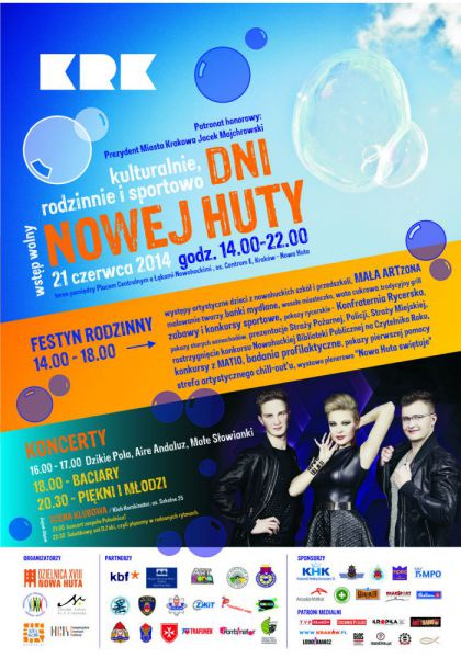 Pierwszy weekend lata Nowa Huta uczci wielką zabawą. W sobotę 21 czerwca, w godz. 14.00-22.00 Rada Dzielnicy XVIII, Międzyszkolny Ośrodek Sportowy Kraków - Nowa Huta Ośrodek Kultury im. C. K. Norwida oraz Nowohuckie Centrum Kultury zapraszają wszystkich mieszkańców dzielnic nowohuckich na imprezę plenerową pn. DNI NOWEJ HUTY, która podobnie jak w zeszłym roku odbędzie się na terenie pomiędzy Placem Centralnym a Łąkami Nowohuckimi (os. Centrum E).