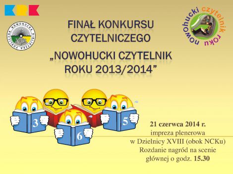 O godz. 15.30 na scenie głównej nastąpi ogłoszenie wyników 11. edycji konkursu czytelniczego. Uczestnicy pikniku dowiedzą się kto zasłużył na tytuł Nowohuckiego Czytelnika Roku 2013/14”. Serdecznie zapraszamy wszystkich czytelników Nowohuckiej Biblioteki Publicznej i mieszkańców Krakowa.