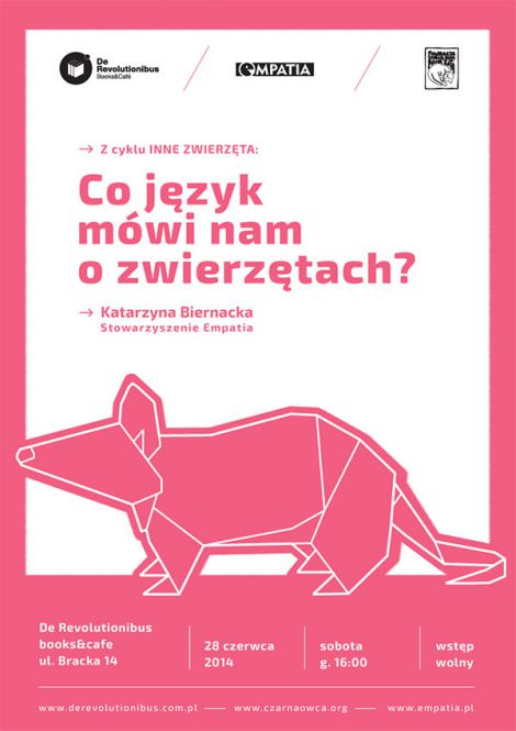 Fundacja Czarna Owca Pana Kota we współpracy ze Stowarzyszeniem Empatia i księgarnią De Revolutionibus. Books&Cafe zaprasza na spotkanie z Katarzyną Biernacką „Co język mówi nam o zwierzętach?”.