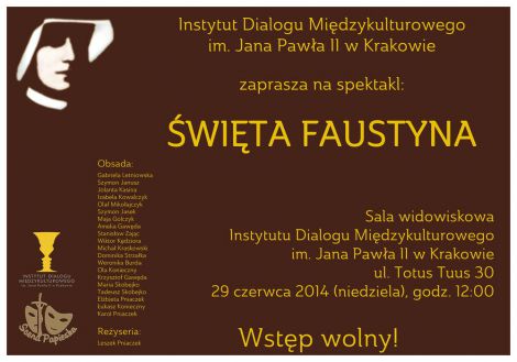 Już w najbliższą niedzielę 29 czerwca 2014 Teatr Scena Papieska zaprasza na ostatni w tym sezonie spektakl pt. "Święta Faustyna", reż. Leszek Pniaczek.