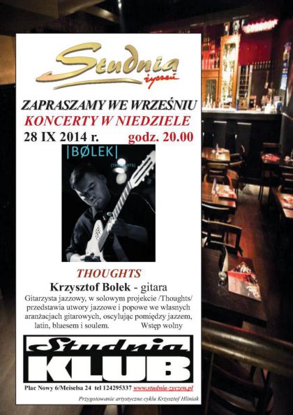 Gitarzysta jazzowy, w solowym projekcie /Thoughts/ przedstawia utwory jazzowe i popowe we własnych aranżacjach gitarowych, oscylując pomiędzy jazzem, latin, bluesem i soulem. Wstęp wolny