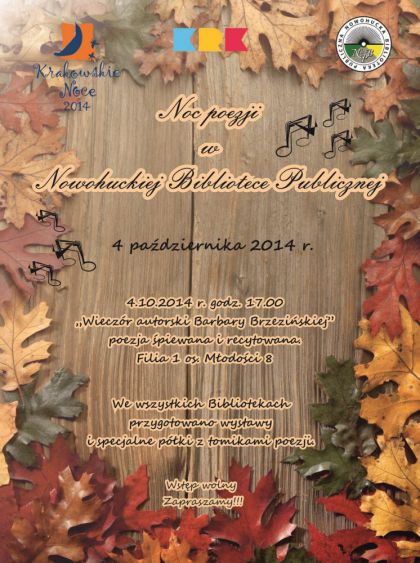 Nowohucka Biblioteka Publiczna w Krakowie włączyła się w organizację tegorocznej edycji Nocy Poezji. We wszystkich placówkach bibliotecznych zostaną zorganizowane POETYCKIE PÓŁKI. Wiodącym wydarzeniem Nocy Poezji w Bibliotece będzie „Wieczór autorski Barbary Brzezińskiej” - poezja śpiewana i recytowana. Filia 1 przygotuje również wystawę pt. „Poeci na scenie życia”, będzie to ekspozycja tomików poezji i krótkich biogramów poetów nowohuckich m.in.: Barbary Urbańskiej, Hanny Wietrzny, Alicji Pochylczuk i dr. Stanisława Wilkonia.