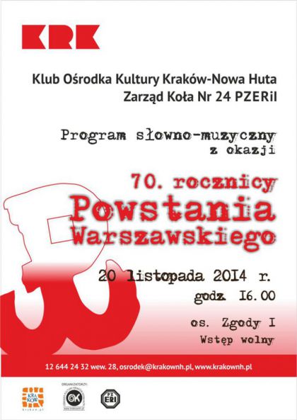 W 2014 r. obchodzimy 70. rocznicę wybuchu Powstania Warszawskiego. Z tej okazji Klub Ośrodka Kultury Kraków-Nowa Huta (os. Zgody 1) zaprasza 20 listopada 2014 r. o godz. 16.00 na program słowno-muzyczny będący wyrazem pamięci oraz uhonorowaniem poświęcenia i walki Powstańców Warszawskich z 1944 r., który przygotował zespół Zawilec. W programie znajdują się wiersze i piosenki powstańcze. Partnerem wydarzenia jest Zarząd Koła nr 24 PZERiI.