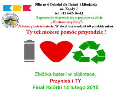 W Oddziale dla Dzieci i Młodzieży Filii nr 4 Nowohuckiej Biblioteki Publicznej w Krakowie ruszyła akcja recyklingowa zbieramy baterie i bateryjki, finał jest zaplanowany na 14 lutego 2015 roku.