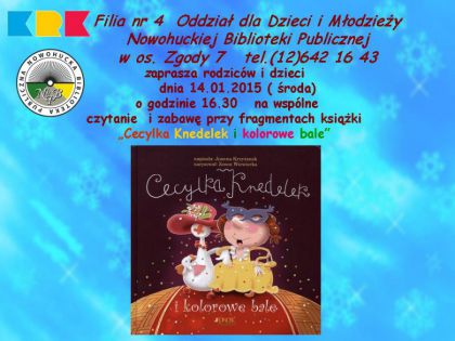 W cyklu: „Kroplówka z literatury” Biblioteka zaprasza na wspólne czytanie dla dzieci i rodziców. Uczestnicy spotkania poznają przygody Cecylki Knedelek, dowiedzą się jak Cecylka i jej przyjaciele przygotowywali się do balu sylwestrowego i jak się bawili. Prawdopodobnie będzie też przyrządzany owocowy poncz i biszkoptowe świnki Cecylki. Biblioteka zaprasza wszystkich, którzy lubią dobrą zabawę, karnawałowy nastrój i towarzystwo przyjaciół. Zajęcia dla dzieci w wieku 4-6 lat.