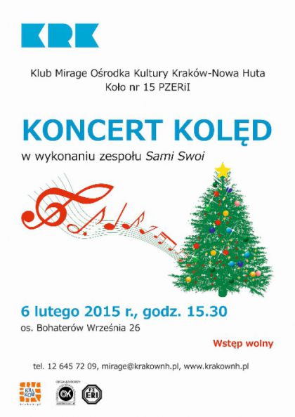 Wspólne kolędowanie to piękna polska tradycja. Kolęda jest niezwykle cennym, bo zawierającym proste prawdy utworem, który otwiera nas na tajemnice narodzin Chrystusa. By nie zapomnieć o tej tradycji zapraszamy wraz z PZERiI do Klubu Mirage Ośrodka Kultury-Kraków-Nowa Huta na koncert kolęd w wykonaniu zespołu Sami Swoi, który powstał przy Stowarzyszeniu Emerytów Rencistów i Inwalidów Przyjaźń w Żarkach. Usłyszymy najpiękniejsze polskie kolędy i pastorałki, które sprawią, że powrócimy jeszcze na chwilę w magiczny klimat świąt Bożego Narodzenia.