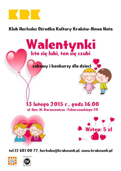 Zapraszamy wszystkie dzieci w wieku 4-12 lat na walentynkowe spotkanie w Klubie Herkules Ośrodka Kultury Kraków-Nowa Huta, podczas którego będzie można dowiedzieć się, dlaczego św. Walenty jest patronem zakochanych a także od kiedy w Polsce pojawiła się tradycja obchodzenia święta zakochanych. W programie znajdą się także konkursy i zabawy m.in. poczta walentynkowa, polowanie na balony, walentynkowa skrzynia skarbów.