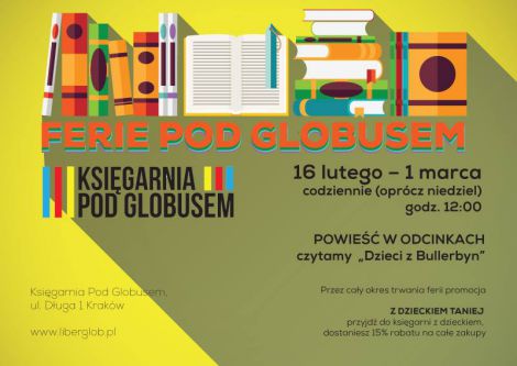 W czasie ferii Księgarnia Pod Globusem zaprasza do codziennej wspólnej lektury powieści w odcinkach oraz proponuje rabaty dla wszystkich, którzy przyjdą na zakupy z dziećmi.