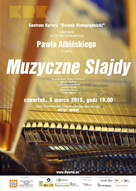 Recital fortepianowy wykona pianista Paweł Albiński, a w programie znajdą się nieznane kompozycje pochodzące z Łotwy, Anglii, Portugalii i Austrii - m.in.: L. Garūty i J. Vianna da Motty. Całość widowiska zakończy pierwsze w Polsce publiczne wykonanie fortepianowych dzieł F. Deliusa. Sukces poprzedniej edycji „Muzycznych Slajdów” uświadomił ogromne zainteresowanie publiczności poznawaniem muzyki poprzez audiowizualne formy jej przedstawiania. Połączenie obrazu, historii i recitalu fortepianowego dostarcza odbiorcom głębokich przeżyć i wiedzy, którą będą pamiętać przez długi czas.