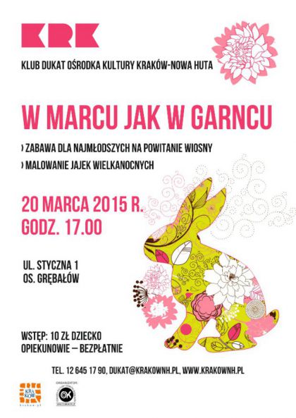 20 marca o godz. 17.00 zapraszamy najmłodszych na szaloną zabawę wiosenną w Klubie Dukat Ośrodka Kultury Kraków-Nowa Huta (ul. Styczna 1). W programie spotkania znajdą się zabawy, konkursy, wspólne tańce. We wspaniałych humorach i miłej atmosferze pożegnamy zimę i przywitamy wiosnę. Ponieważ zbliżają się Święta Wielkanocne, wspólnie przygotujemy także kolorowe pisanki. Zabawa prowadzona będzie przez animatora, a towarzyszyć jej będzie - jak zawsze - słodki poczęstunek.