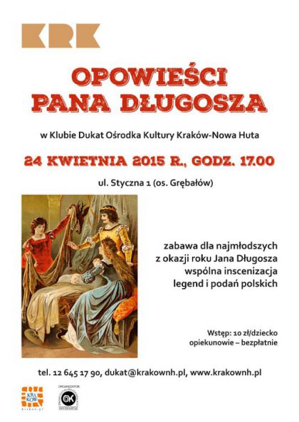 Klub Dukat Ośrodka Kultury Kraków-Nowa Huta (ul. Styczna 1) zaprasza dzieci w wieku od 2 do 10 lat wraz z rodzicami na niezwykłe spotkanie podczas, którego przeniesiemy się w czasie. Dzieci wezmą udział m.in. w animowanej inscenizacji legend polskich. Zabawa - realizowana w roku Jana Długosza - ma na celu przybliżenie dzieciom historycznych i legendarnych postaci polskich. Zabawa prowadzona będzie przez animatora, a towarzyszyć jej będzie słodki poczęstunek. Wszystko to 24 kwietnia od godz. 17.00.