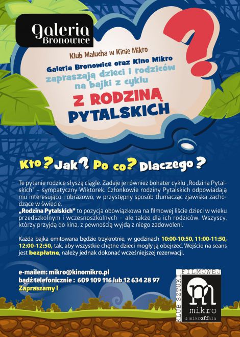 „Rodzina Pytalskich” to idealna propozycja dla dzieci w wieku przedszkolnym i wczesnoszkolnym. Bajki emitowane będą trzykrotnie w godzinach 10.00-10.50, 11.00-11.50 oraz 12.00-12.50 w Kinie Mikro – na 1 piętrze Galerii Bronowice. Wejście na seans jest bezpłatne, należy jednak dokonać wcześniejszej rezerwacji drogą mailową: mikro@kinomikro.pl bądź telefonicznie: 609 109 116 lub 12 634 28 97.