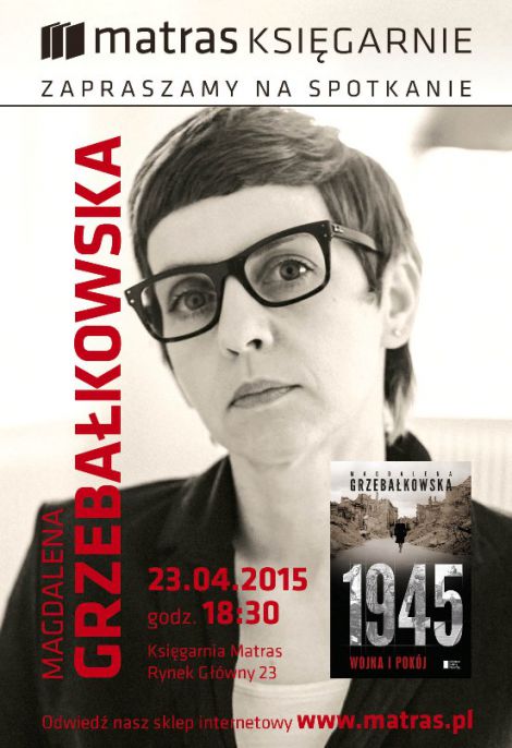23 kwietnia sieć Matras zaprasza mieszkańców Krakowa do wspólnego świętowania Światowego Dnia Książki. W księgarni na Rynku Głównym odbędzie się spotkanie z Magdaleną Grzebałkowską, autorką reporterskiej powieści „1945. Wojna i pokój”. Wydarzenie jest elementem obchodów Światowego Dnia Książki, które w księgarni Matras potrwa cały dzień.