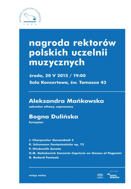 W środę 20 maja o godzinie 19:00 we wnętrzu Sali koncertowej przy ul. św. Tomasza 43 zabrzmi muzyka saksofonowa. Wystąpi duet z Akademii Muzycznej im. G.K. Bacewiczów w Łodzi: Aleksandra Mańkowska, grająca na saksofonie altowym i sopranowym oraz Bogna Dulińska, towarzysząca na fortepianie. Zabrzmią kompozycje m.in. J. Charpentiera, R. Schumanna oraz P. Hindemitha. Wstęp na koncert wolny.