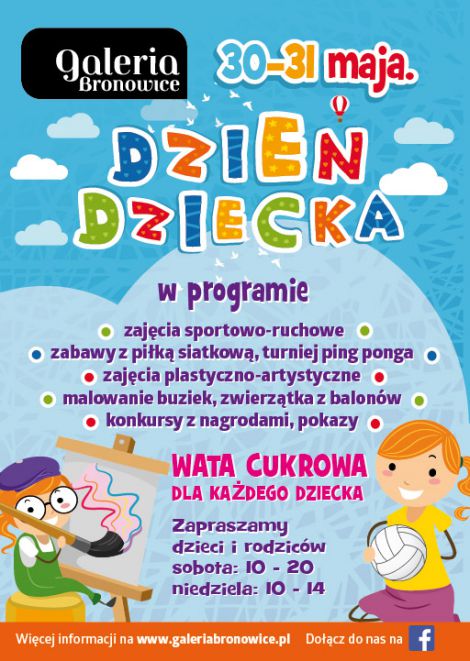 Już za kilka dni największe święto wszystkich pociech – Dzień Dziecka. Z tej okazji, w ostatnie dwa dni maja, Galeria Bronowice przygotowała moc atrakcji sportowych i artystycznych dla wszystkich najmłodszych. Zaplanowane zajęcia odbywać się będą w trzech strefach tematycznych – fitness, sport i art. Jedno jest pewne – w najbliższy weekend każde dziecko znajdzie coś dla siebie.
