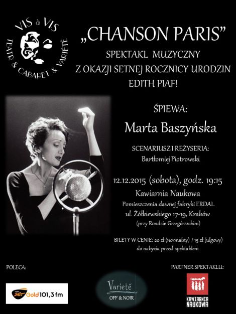 W wyjątkowym programie „CHANSON PARIS” - najpiękniejsze piosenki Edith Piaf, francuskie szlagiery oraz przeboje Ewy Demarczyk, a także wiersze Jacquesa Preverta i Haliny Poświatowskiej - zaśpiewa Gwiazda scen muzycznych, artystka Teatru VIS a VIS - Marta Baszyńska.