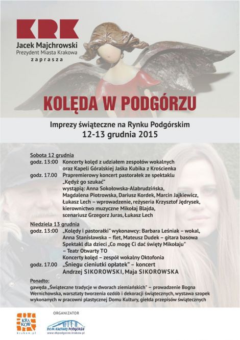 Kolęda w Podgórzu” odbędzie się w sobotę i niedzielę, 12 i 13 grudnia, na Rynku Podgórskim. W programie imprezy zaplanowano m.in. występy zespołów tanecznych z dworu Czeczów, giełdę przepisów świątecznych, warsztaty tworzenia stroików i ozdób świątecznych, wystawę szopek wykonanych przez dzieci. Odbędzie się również konkurs na dekorację stołu świątecznego. Kolędy i pastorałki zaśpiewają uczestnicy eliminacji do Międzynarodowego Festiwalu Kolęd i Pastorałek im. ks. Szwarlika w Będzinie.