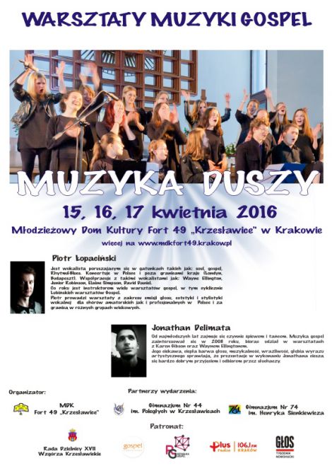 W dniach od 15 do 17 kwietnia 2016 roku, Młodzieżowy Dom Kultury Fort 49 „Krzesławice” w Krakowie os. Na Stoku 27b, serdecznie zaprasza na muzyczne i duchowe wydarzenie. Dnia 15 kwietnia w godzinach popołudniowych, rozpoczną się na terenie MDK Warsztaty Muzyki Gospel. Uwieńczeniem 3-dniowych warsztatów będzie koncert finałowy, który odbędzie się 17 kwietnia w Kościele Miłosierdzia Bożego, os. Na Stoku 1A.