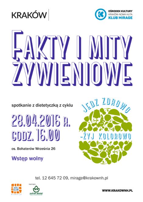 Jedz zdrowo-żyj kolorowo to cykl spotkań dla seniorów promujący zdrowy styl życia, na które serdecznie zaprasza Klub Mirage Ośrodka Kultury Kraków-Nowa Huta (os. Bohaterów Września 26). Odżywianie seniora to nie tylko liczenie kalorii. Zbilansowana dieta i aktywność fizyczna przyczyniają się do lepszej jakości życia i braku chorób. Uczestnicy spotkania, które odbędzie się 28 kwietnia o godz. 16:00 dowiedzą się jakie składniki w diecie będą przeciwdziałać problemom ze zdrowiem a których należy się wystrzegać. Jak ograniczyć ryzyko niedoboru witamin. Dietetycy pokarzą jak komponować posiłki aby wspomagały sprawność fizyczną, psychiczną oraz spowalniały procesy starzenia. Spotkania poprowadzą eksperci z Centrum Dietetycznego Naturhouse - światowego lidera w dziedzinie dietetyki i żywienia.