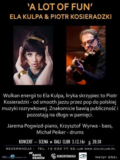 Wulkan energii to Ela Kulpa, liryka skrzypiec to Piotr Kosieradzki - od smooth jazzu przez pop do polskiej muzyki rozrywkowej. Znakomicie bawią publiczność i pozostają na długo w pamięci.