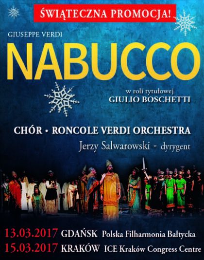 W rolę tytułową wcieli się znany polskiej publiczności z koncertów Verdi Gala Giulio Boschetti. W widowisku operowym w roli Abigail wystąpi Silvia Rampazzo. Towarzyszyć im będzie chór Opery Polskiej oraz Roncole Verdi Orchestra.