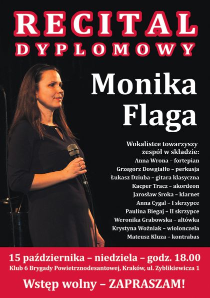Bardzo serdecznie zapraszam na mój recital, który odbędzie się 15 października br. o godzinie 18:00 w Klubie 6 Brygady Powietrznodesantowej przy ulicy Zyblikiewicza 1 w Krakowie. Bardzo mocno liczę na Waszą obecność, ponieważ jest to dla mnie wielkie wydarzenie i chciałabym go przeżyć w gronie rodziny i przyjaciół.