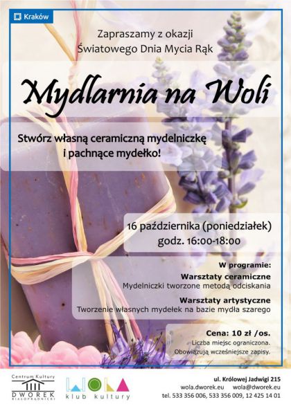 Stwórz własną ceramiczną mydelniczkę i pachnące mydełko! Klub Kultury "Wola" (ul. Królowej Jadwigi 215) zaprasza na rodzinne warsztaty z okazji Światowego Dnia Mycia Rąk.