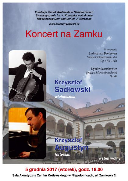 5 grudnia o godz. 18:00 w Sali Akustycznej w Zamku Królewskim w Niepołomicach wystąpią znakomici artyści, absolwenci Akademii Muzycznej w Krakowie, laureaci konkursów muzycznych: wiolonczelista Krzysztof Sadłowski i pianista Krzysztof Augustyn. Artyści wykonają dwie sonaty: sonatę wiolonczelową F dur, Op. 5 No. 1Edit Ludwiga van Beethovena oraz sonatę wiolonczelową d moll, Op. 40 Dymitra Szostakowicza. Wstęp na koncert wolny.