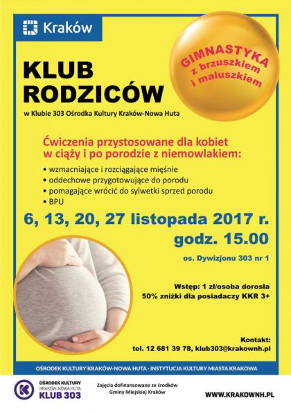 Klub 303 Ośrodka Kultury Kraków-Nowa Huta (os. Dywizjonu 303 nr 1) zaprasza w poniedziałek 20 listopada w godz. 15.00-15.45 na Gimnastykę dla kobiet w ciąży i po porodzie z niemowlakiem. W programie zajęć: ćwiczenia wzmacniające mięśnie, ćwiczenia oddechowe przygotowujące do porodu, ćwiczenia BPU po porodzie oraz seria ćwiczeń wzmacniających i rozciągających mięśnie, korygujących ewentualną nadwagę, kształtujących sylwetkę sprzed porodu.