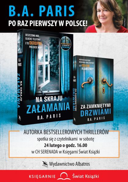 Druga powieść B.A. Paris - "Na skraju załamania", trafiła do księgarń 15 lutego 2018 roku. Spotkanie autorki z czytelnikami w Krakowie poprowadzi Bartek Czartoryski. Uczestnicząc w spotkaniu będzie można również skorzystać z oferty Café Świat Książki.