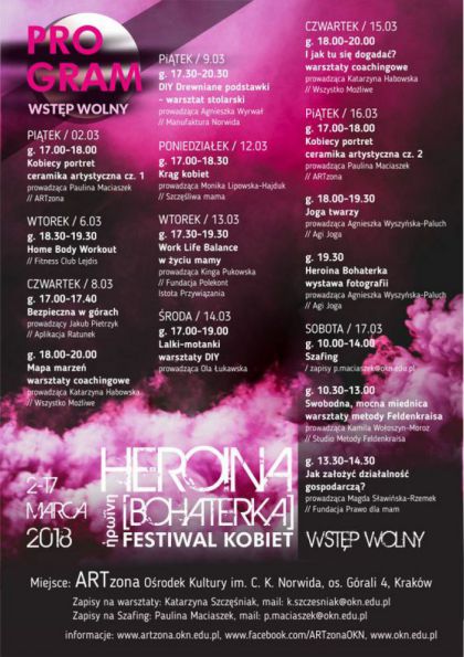 Czwarta edycja festiwalu w ramach którego odbędzie się kilkanaście bezpłatnych spotkań, warsztatów i wydarzeń skierowanych do kobiet. W tym m.in. warsztaty coachingowe, artystyczne, relaksacyjne, warsztaty z majsterkowania, warsztaty taneczne, DIY (pełny program w rozwinięciu).