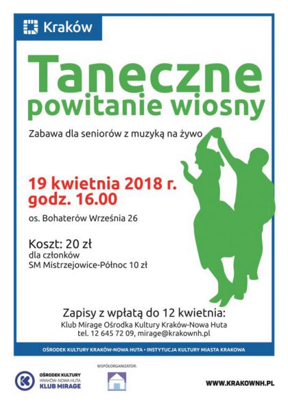 Klub Mirage Ośrodka Kultury Kraków-Nowa Huta (os. Bohaterów Września 26) zaprasza 19 kwietnia o godz. 16.00 na Taneczne powitanie wiosny. Taniec sprzyja integracji i zdobywaniu nowych znajomości, pobudza krążenie i poprawia humor - zwłaszcza przy znanych i lubianych melodiach. Okazję, by się to tym przekonać będą mieli seniorzy podczas zorganizowanego dla nich w Klubie Mirage wieczorku tanecznego.