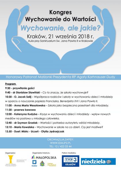 Instytut Dialogu Międzykulturowego im. Jana Pawła II w Krakowie zaprasza 21 września 2018 r. do Auli przy Sanktuarium św. Jana Pawła II w Krakowie na Kongres Wychowanie do Wartości "Wychowanie, ale jakie?", który skierowany jest do nauczycieli, wychowawców, rodziców. Honorowy Patronat nad wydarzeniem objęła Małżonka Prezydenta RP Agata Korhnauser-Duda.